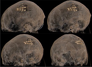 Bei der transkraniellen fokalen Kortexstimuation wird eine dünne Elektrode unter die Haut auf den Schädelknochen gelegt.